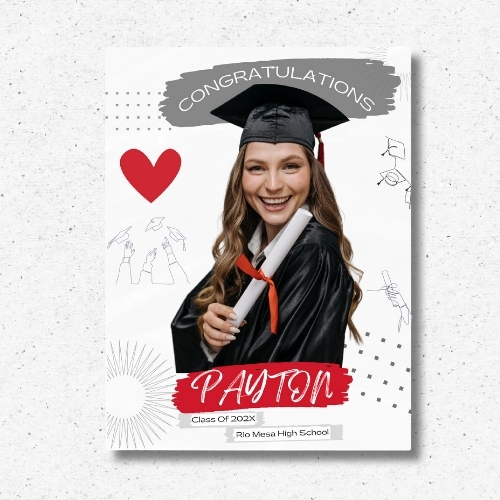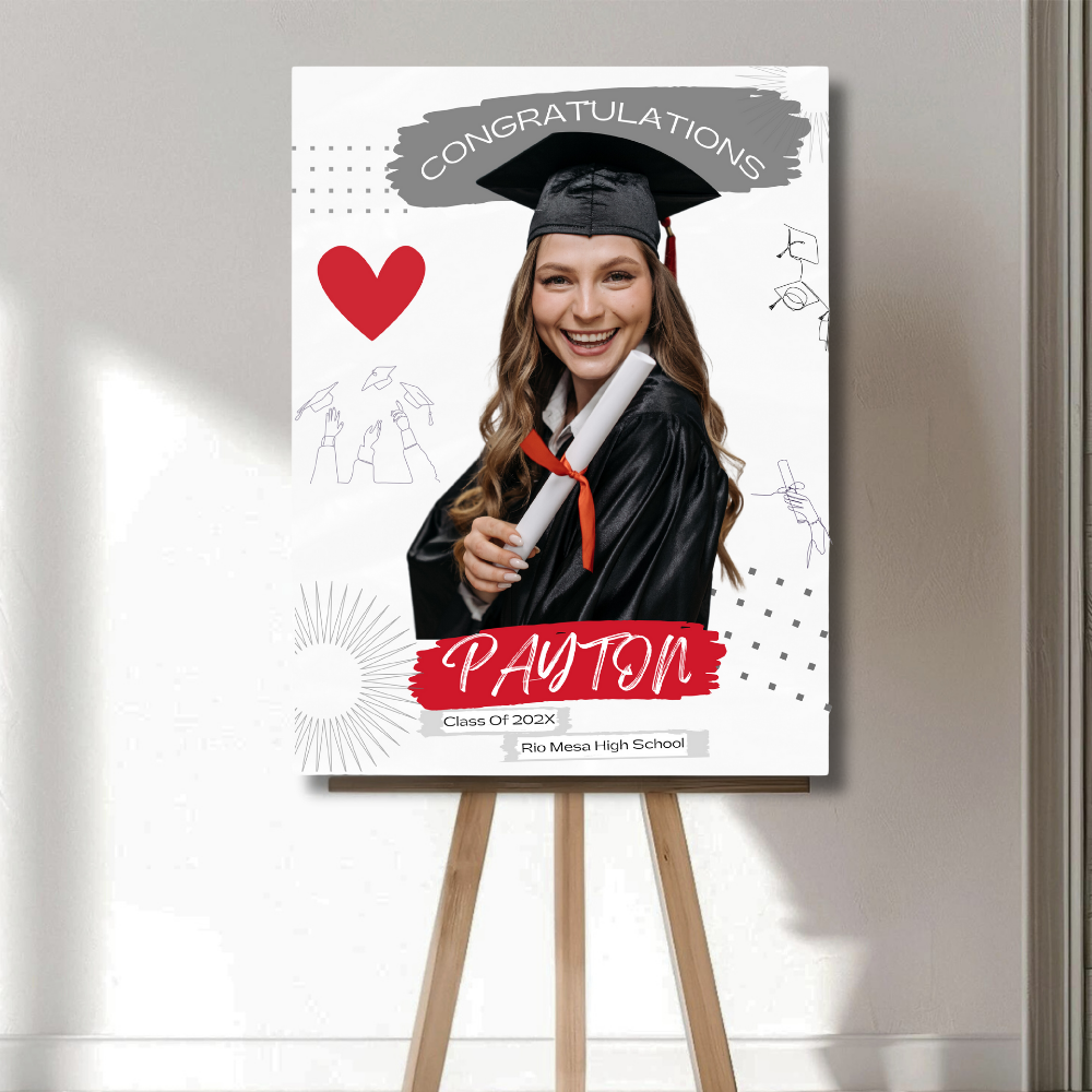 Make your graduate the center of attention with this custom graduation welcome sign! Designed to display proudly on an easel or tabletop, this personalized sign features the graduate’s photo, name, school, and class year. The playful doodles, heart graphic, and modern layout add a cheerful and loving touch to any celebration.