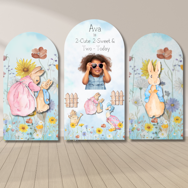 Our Two Sweet Garden Arched 3-Panel Birthday Backdrop Set features three matching arched panels that create a complete, photo-ready birthday moment. The center panel includes a personalized milestone message and child photo, surrounded by soft garden illustrations and storybook character artwork.